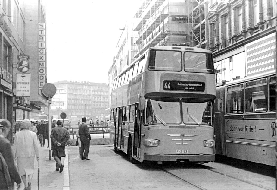 Wagen 245, ein erst kurz zuvor gelieferter Büssing Senator 12R U7 erreichte am 15. Januar 1962 über die  Adolf-Haeuser- Straße den Bahnhof Höchst.